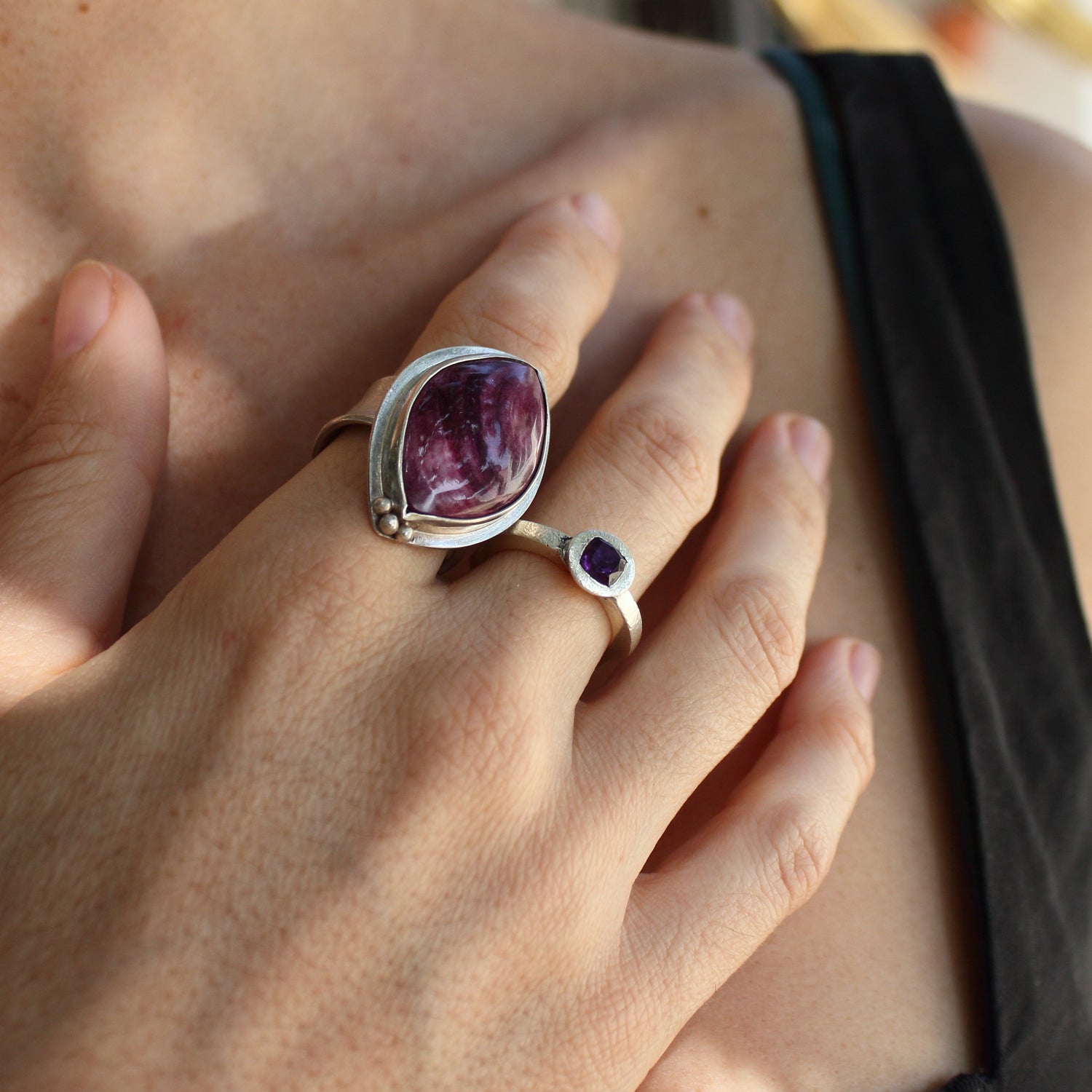 Anillo artesanal de Plata de Ley y Spondylus color morado intenso.