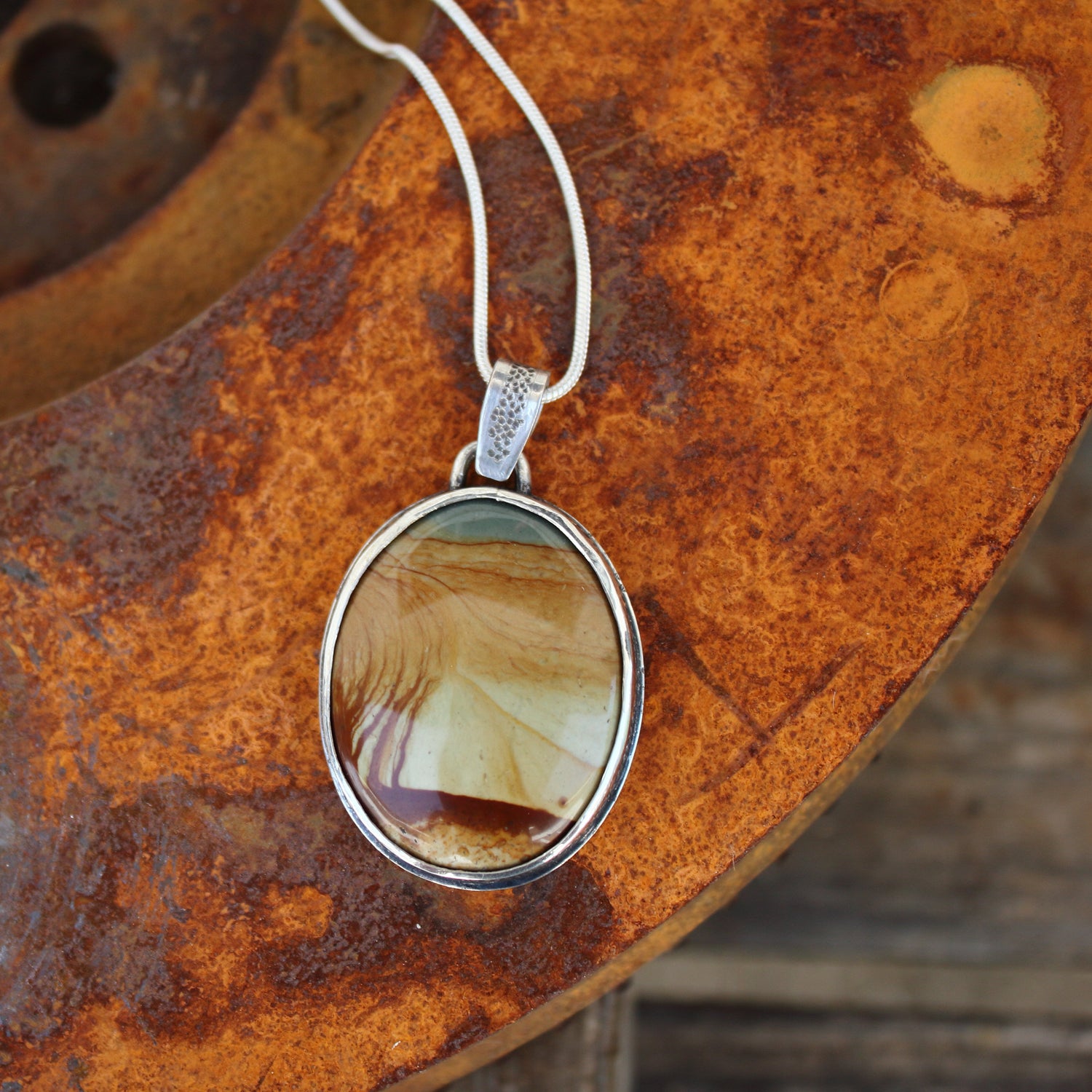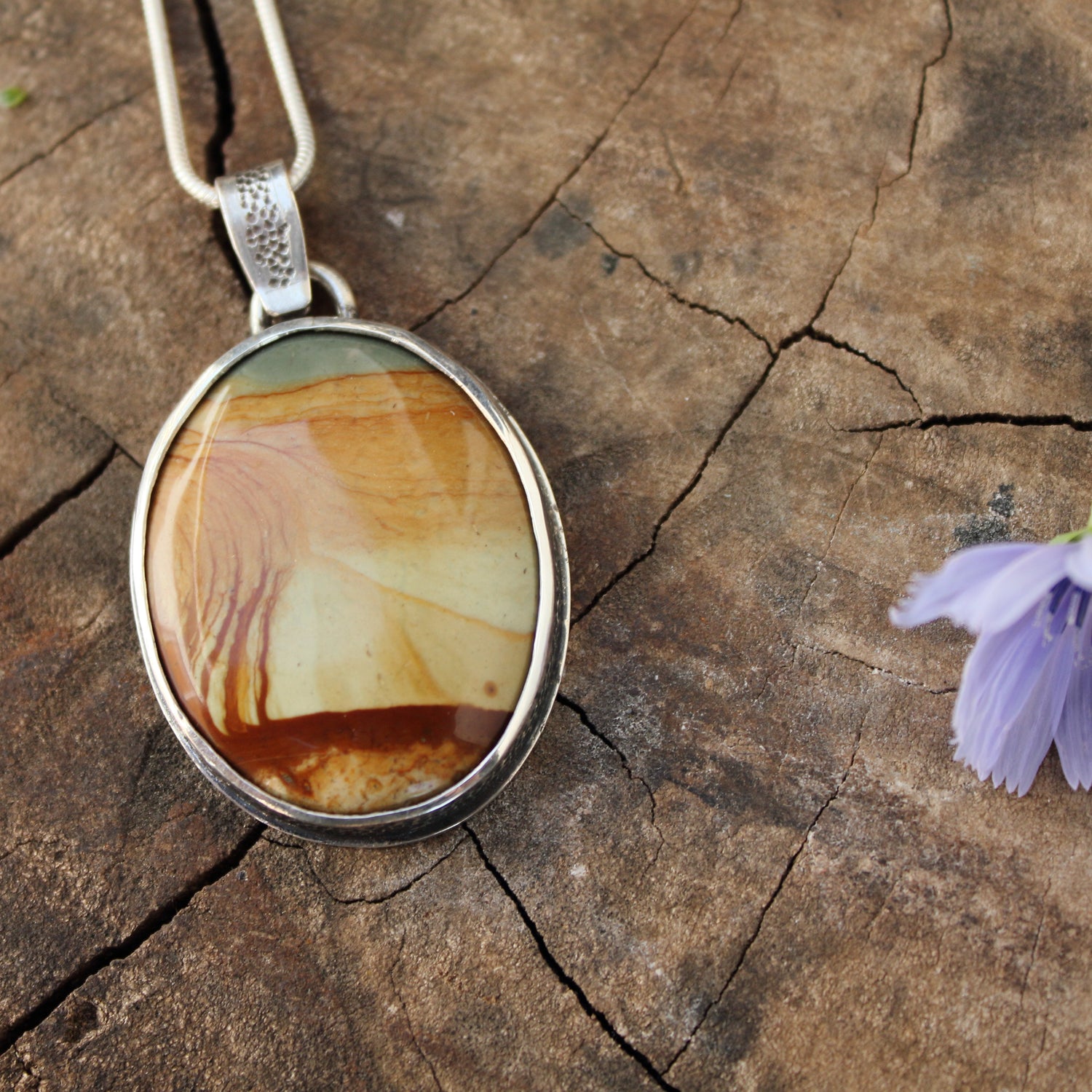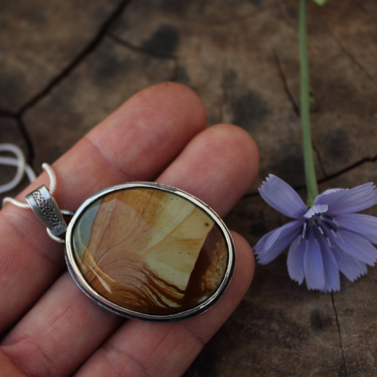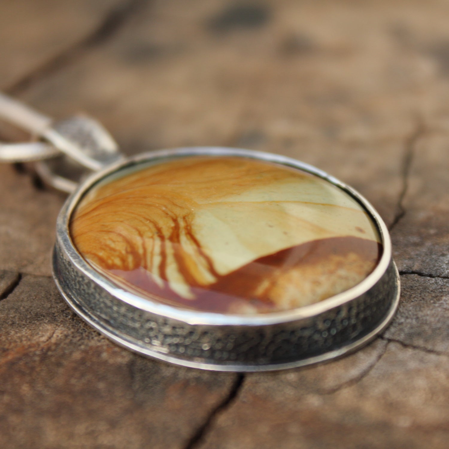 Está engarzada de manera artesanal con plata de ley. El bisel y el pasador tienen una textura rústica hecha con una pequeña fresa.