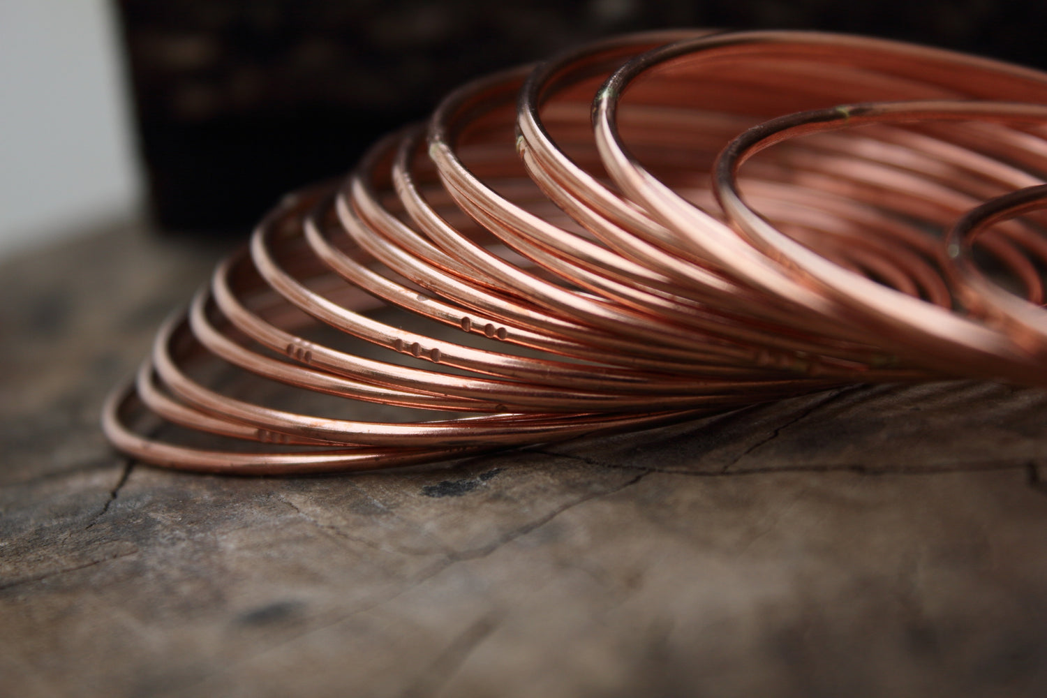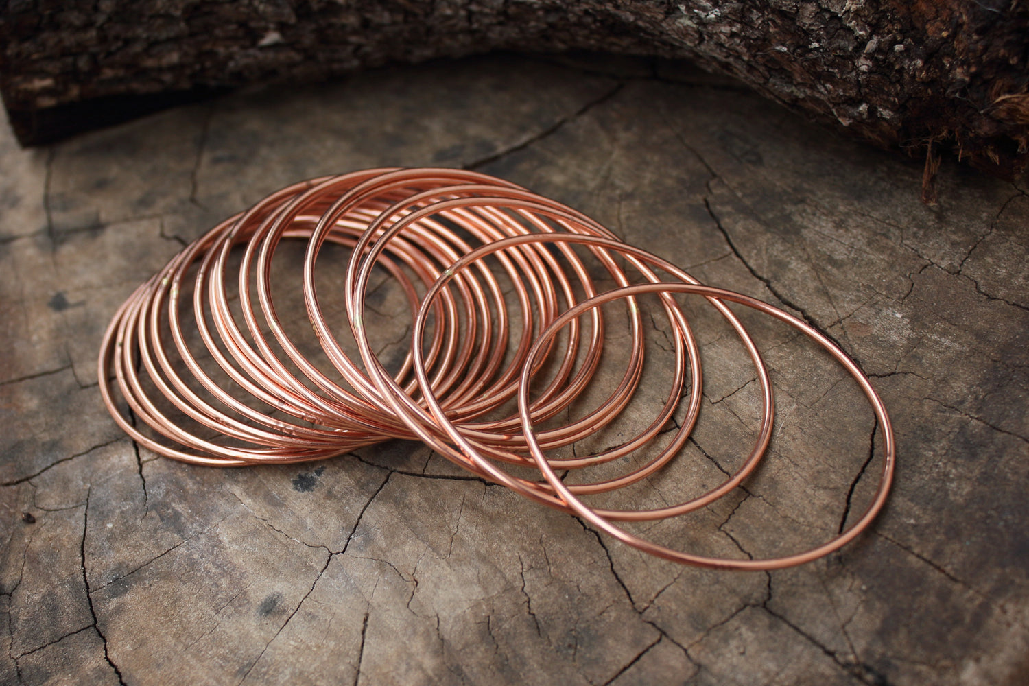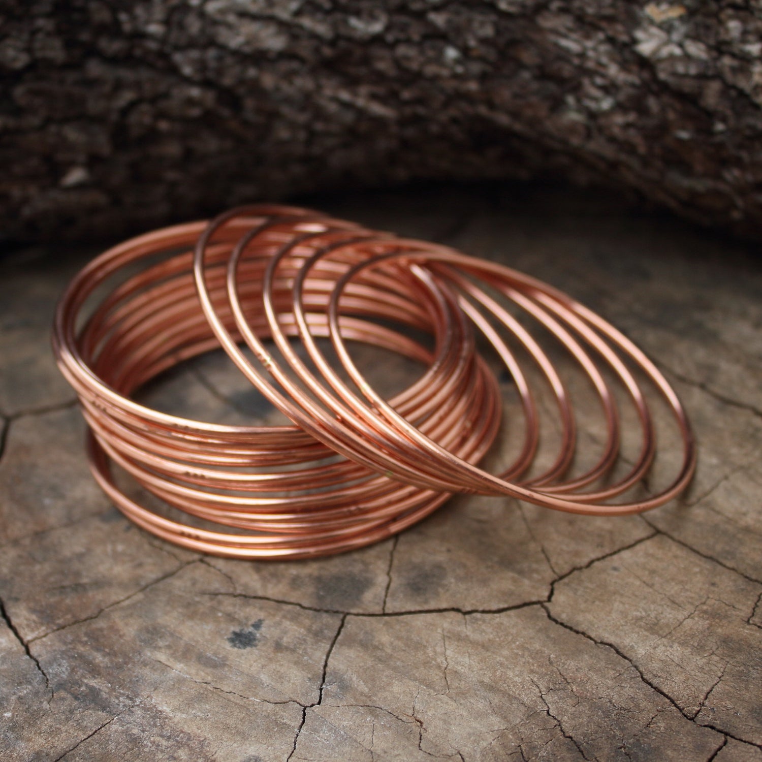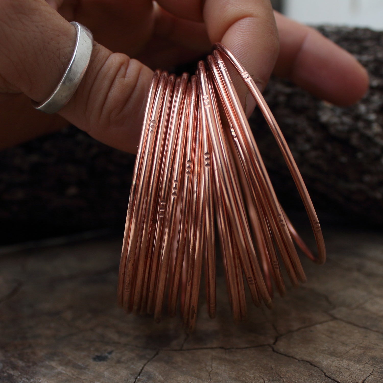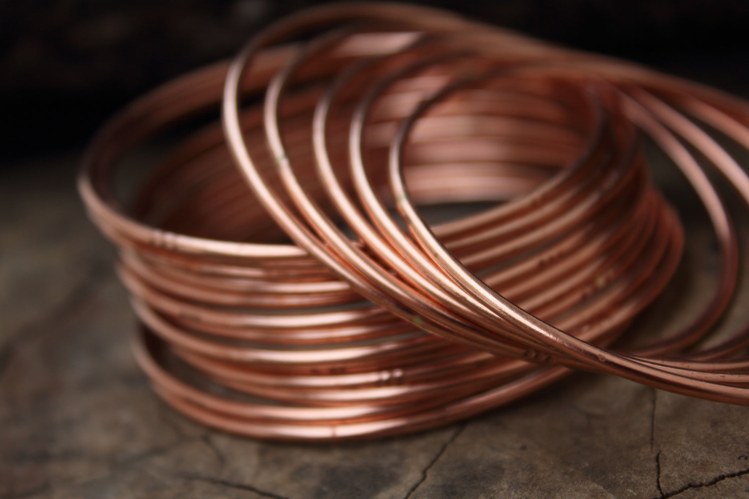 Pulseras finas hechas en cobre para combinar entre ellas o usarlas solas.